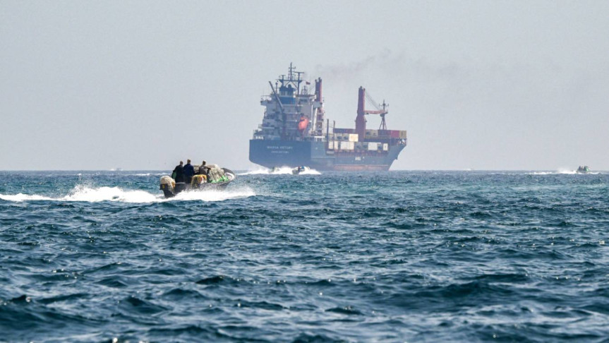 ২০২৫ সালের ২৫ জুন ওমানের উত্তর মুসান্দাম উপদ্বীপের খাসাব উপকূলে হরমুজ প্রণালীতে একটি নৌকা সেন্ট কিটস অ্যান্ড নেভিস-পতাকাবাহী কন্টেইনার জাহাজ মার্সা ভিক্টরির কাছে পৌঁছায়। ছবি: এএফপি