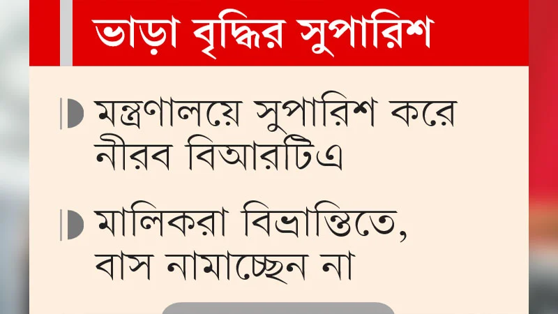 ডিজেলের দাম বৃদ্ধির কারণে বাসের ভাড়া বাড়াতে সরকারের কাছে সুপারিশ পাঠিয়েছে সড়ক পরিবহন কর্তৃপক্ষের (বিআরটিএ) ভাড়া নির্ধারণ কমিটি। ভাড়া কবে থেকে কতটা বাড়তে যাচ্ছে– গোপন রেখেছে বিআরটিএ। এ নিয়ে অনিশ্চয়তায় গতকাল সোমবার রাজধানীতে বাস চলাচল ছিল কম। যান সংকটে ভোগান্তিতে পড়েন যাত্রীরা।